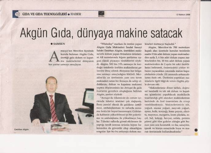 “Whiteday“ markas ile retim yapan Akgn Gda Makineleri malat Sanayi Sahibi Emirhan Akgn, rettikleri makinelerle dolum yapan firmalarn rnlerini AB normlarnda hijyen artlarna uygun olarak piyasaya srdklerini syledi. Akgn, 500 bin YTL sermaye ile kurduu tesislerde retilen makinelerini gelecekte ihra ederek dnyann her blgesine satmay amaladn bildirdi. Merzifon’da un retiminin yan sra tarm makineleri satan bir firmaya da sahip olduklarn, dolum ve kapatma makinesi yapma dncesinin ise Avrupa’da gda fuarlarn gezerken olutuunu belirten Akgn, unlar syledi: